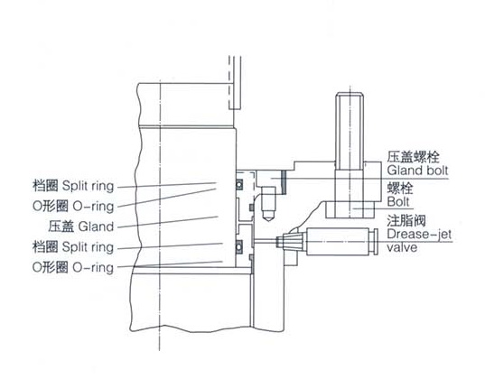 As shown in figure, the sealing of gland is accomplished byorrangement of four O-ring and a sealant injection device.